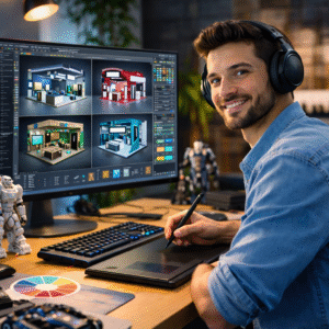 نقدم في شركة الإمداد للفعاليات خدمات تصميم 3D احترافية تشمل:🔹 تصميم بوثات المعارض